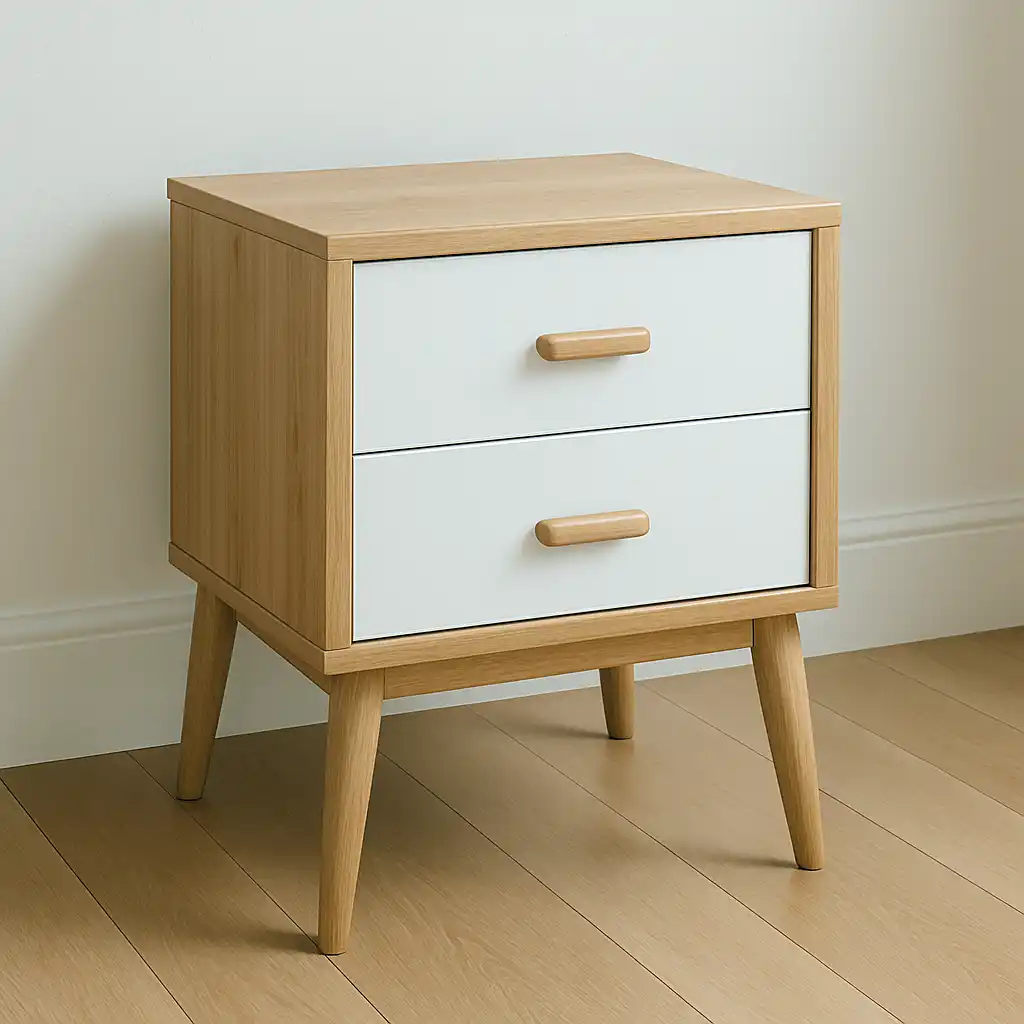 Cam detaylı İskandinav komodinlerde malzeme geçişleri oldukça dengelidir. Amaç dikkat dağıtmak değil, hafif bir vurgu yaratmaktır.
